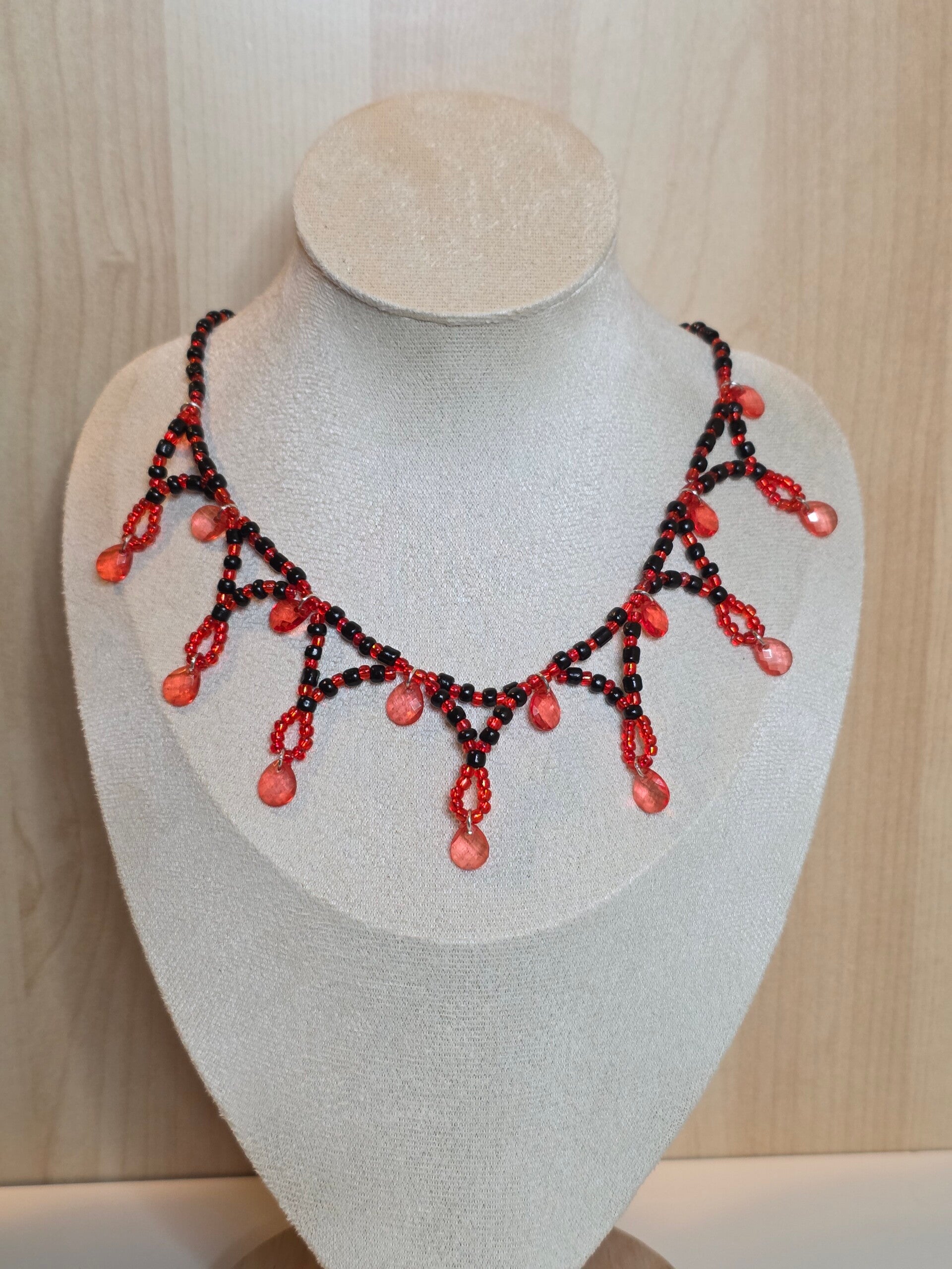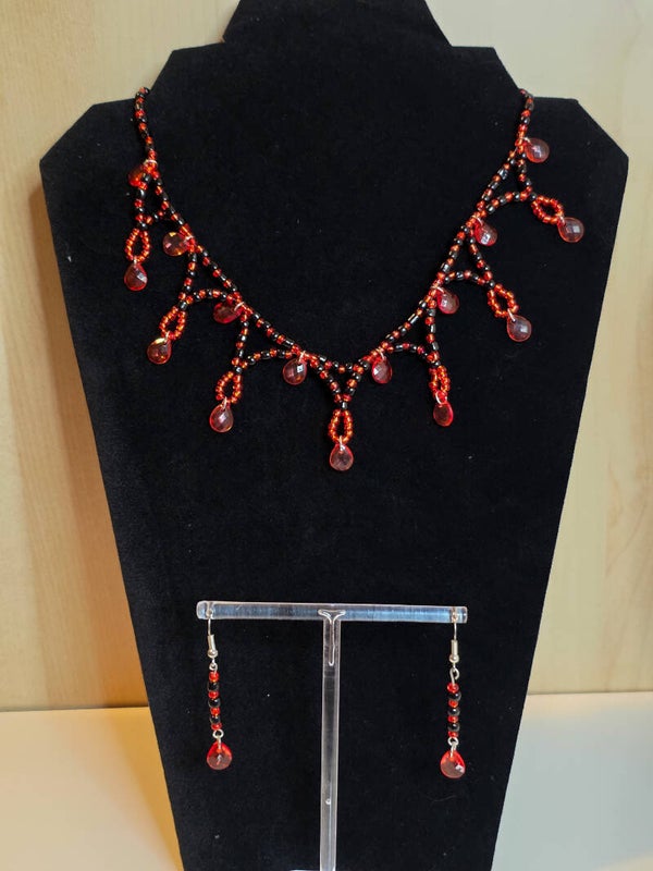 Handmade black and red beaded necklace with matching earrings